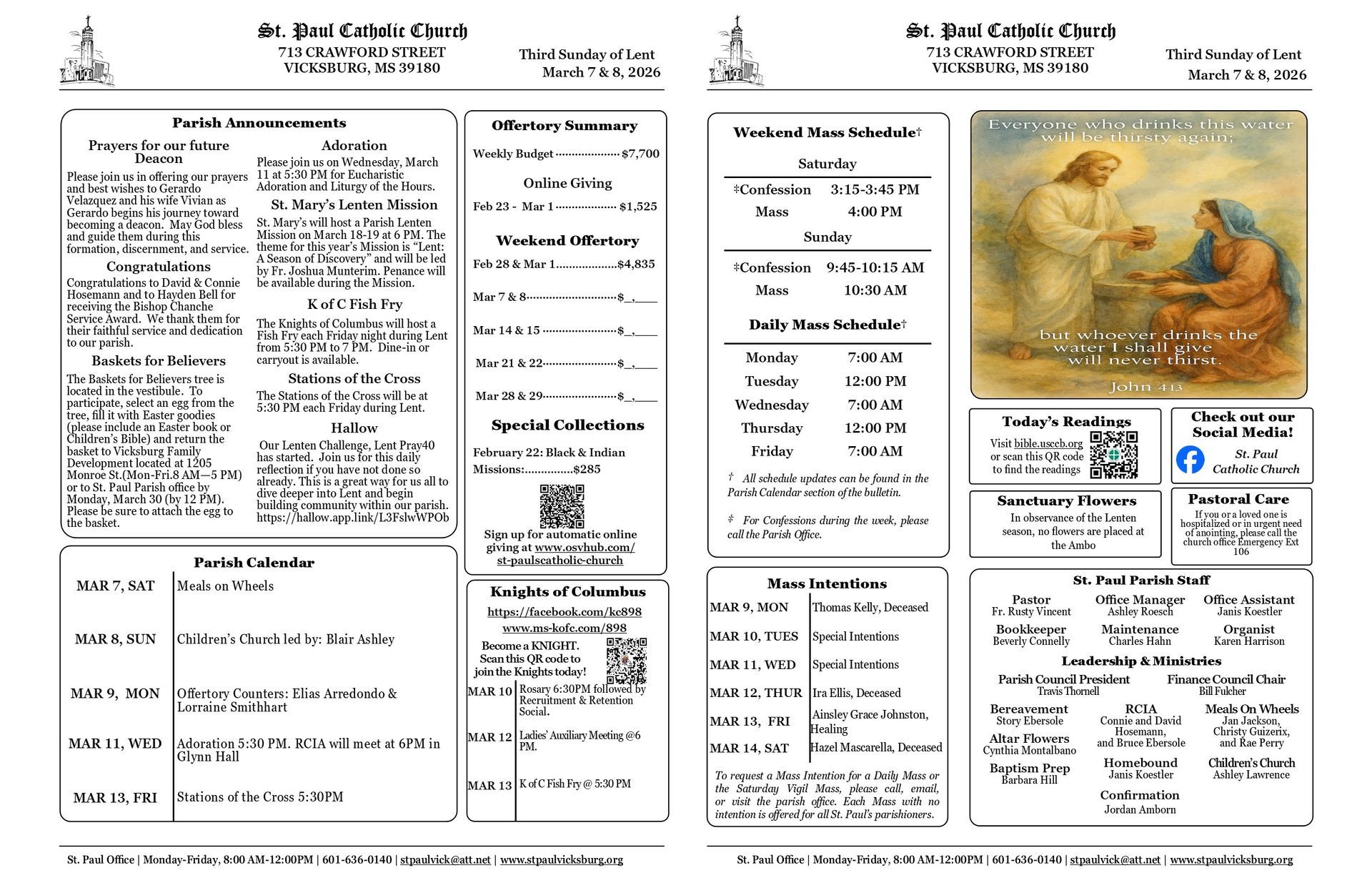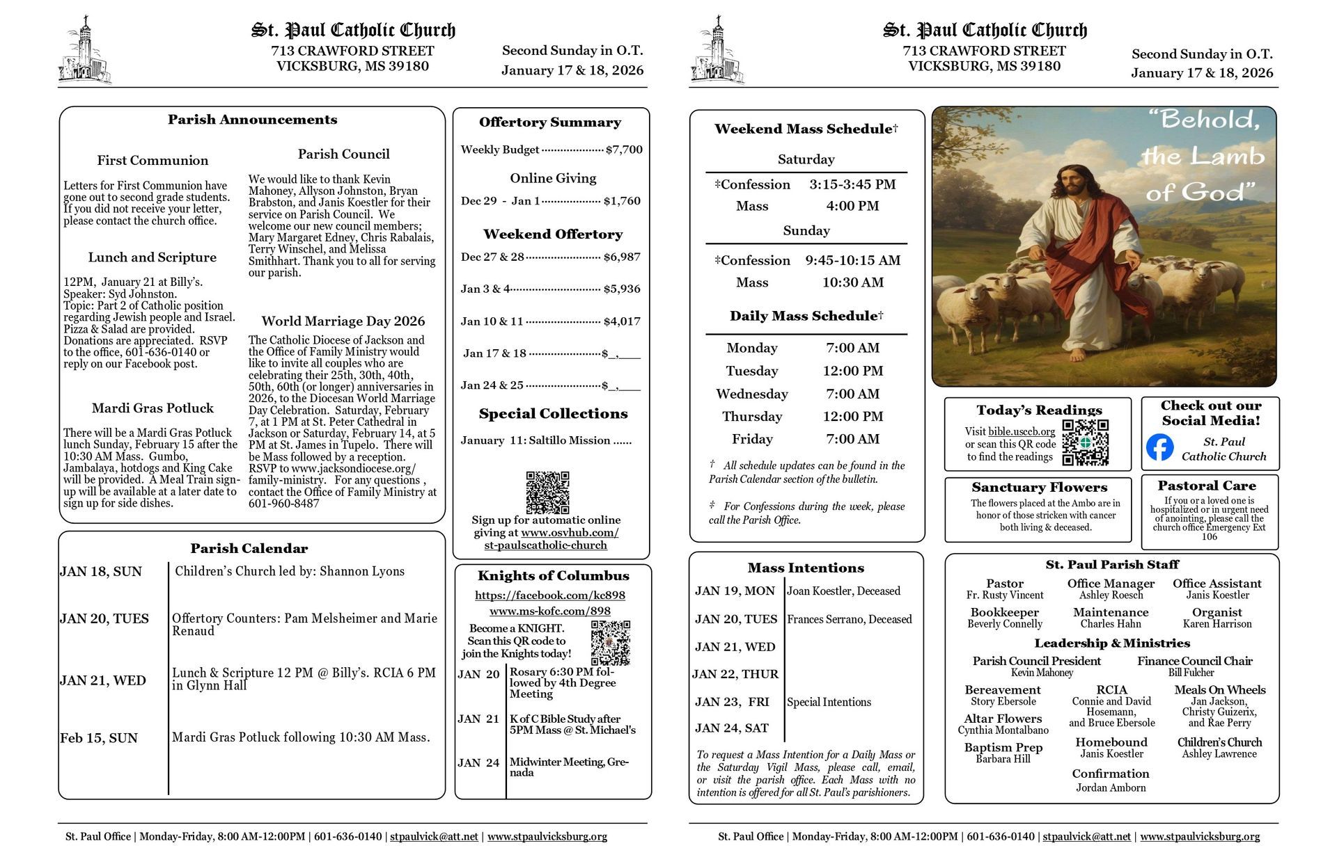 Stay connected to all that's happening here. Download the most recent church bulletins containing announcements, and events, and Mass Times.