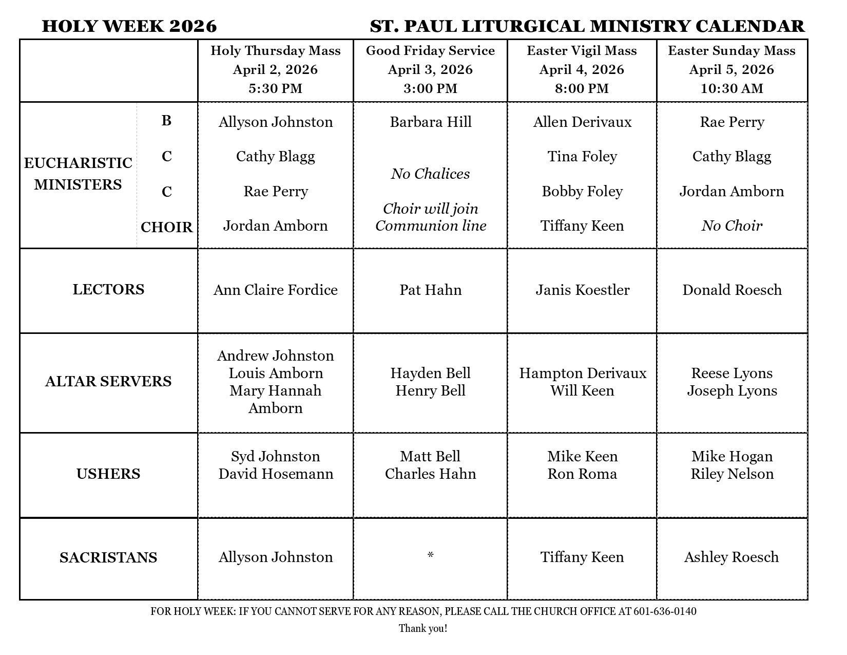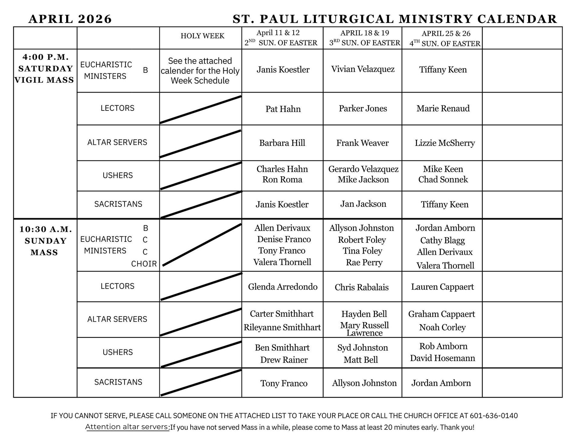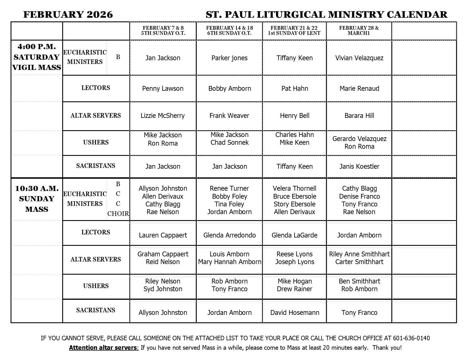 If you cannot make either of these times, please call the parish office at 601-636-0140.